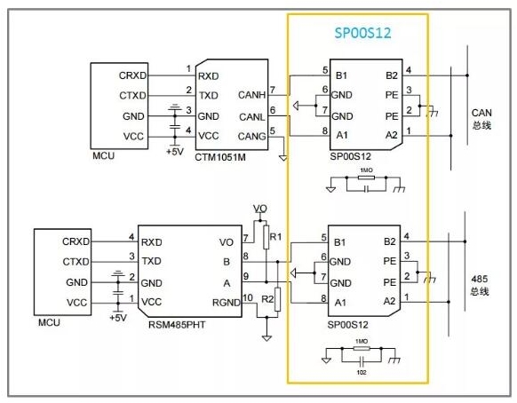 分立元器件方案雖然能夠提供有效的防護(hù),但是需要引入較多的電子器件,這也就意味著接口電路將占用更多的PCB空間,若器件參數(shù)選擇不合適易造成EMC問題。有沒有更簡潔的防護(hù)設(shè)計(jì)呢?答案是肯定的。可選擇引入專業(yè)的信號(hào)浪涌抑制器SP00S12,可用于各種信號(hào)傳輸系統(tǒng),抑制雷擊、浪涌、過壓等有害信號(hào),對設(shè)備信號(hào)端口進(jìn)行保護(hù)。搭配ZLG的全隔離CTM或SC系列的隔離CAN收發(fā)器,如下圖。可極大程度的提升產(chǎn)品的集成度,于此同時(shí)極大程度的縮小開發(fā)周期。