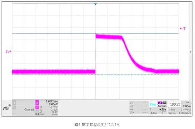 接下來做一下浪涌抗擾度測試,檢驗(yàn)一下浪涌抑制器是否滿足IEC61000-4-5±4KV防護(hù)要求,以共模浪涌測試為例,在SP00S12輸入端加載4KV、1.2/50μs浪涌電壓,在輸出端測試壓降已被降低至17.1V,波形圖如下。